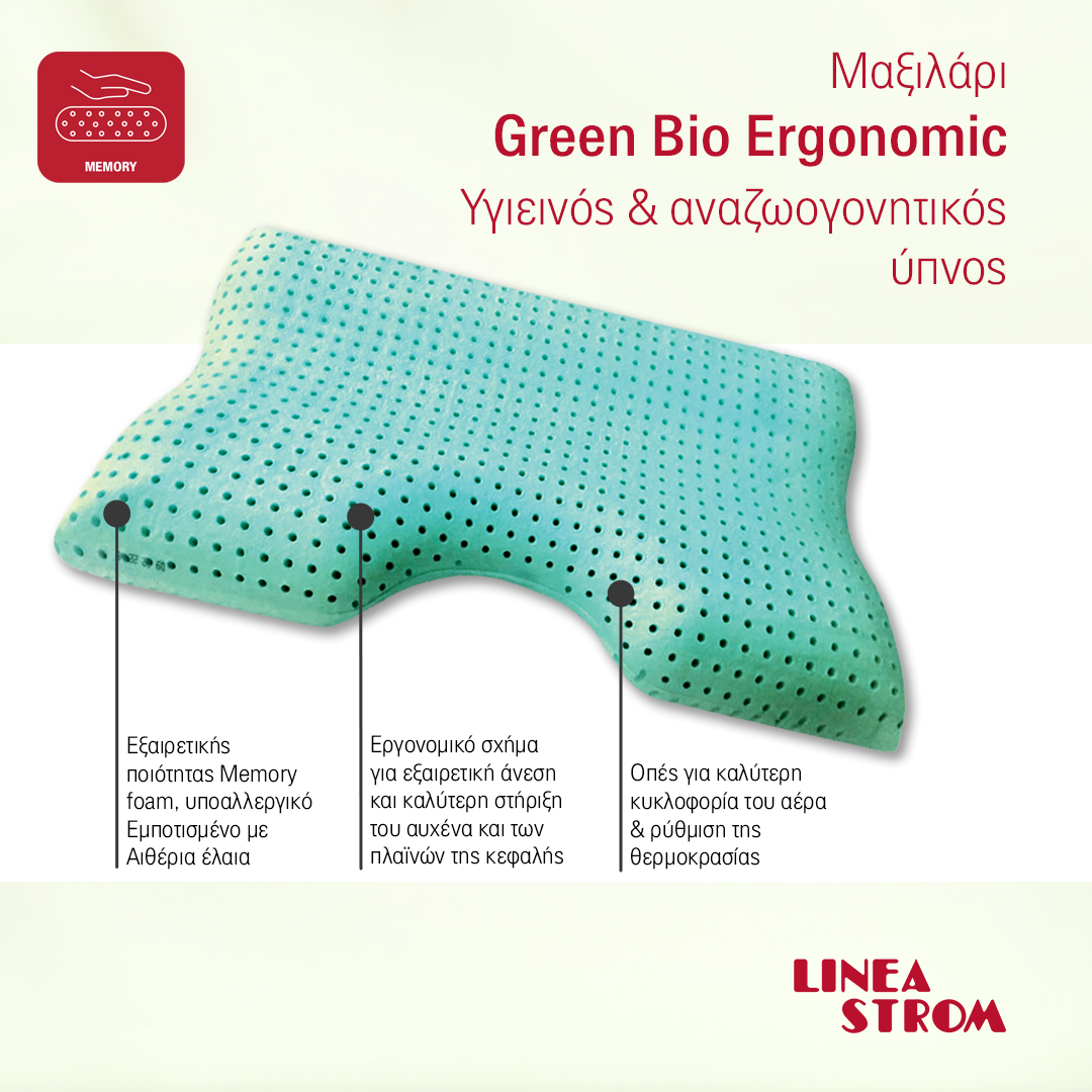 Μαξιλάρι Green Bio _ ERGONOMIC υποαλλεργικό, διαπνέον, σε ειδικό εργονομικό σχήμα για ακόμα καλύτερη στήριξη του αυχένα και των πλαϊνών της κεφαλής. Κατασκευασμένο από υψηλής ποιότητας memory foam, είναι εμποτισμένο με αιθέρια έλαια που θρέφουν το δέρμα και δίνουν ενέργεια ενώ παράλληλα επιταχύνουν τον ύπνο, βοηθούν στη χαλάρωση, και την καλή αναπνοή. Το διάτρητο υλικό συμβάλλει στη διατήρηση της σωστής Θερμοκρασίας διευκολύνει την κυκλοφορία του αέρα και αποτρέπει τη συγκέντρωση υγρασίας και ακάρεων εξασφαλίζοντας